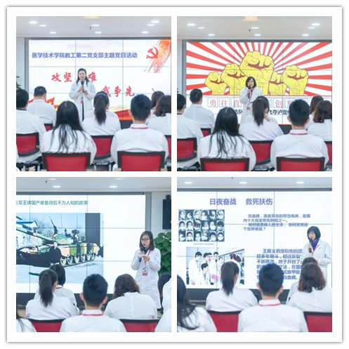党委书记郑沈芳为党员活动中心揭牌,仪式结束后,医学技术学院教工第二党支部“攻坚克难我争先”主题党日活动作为首场活动。“攻坚克难我争先”主题党日活动从党员们讲述突击队的故事展开,三位党员褚小菊、韩丹、莫非声情并茂地带大家回顾了三个不同年代涌现出的党员突击队典范。战争年代“飞夺泸定桥”红四团第2连连长和22名突击队员沿着枪林弹雨和火墙密布的铁索踩着铁链夺下桥头的故事。改革开放时代“99式坦克研发攻坚”“独臂英雄”祝榆生团队长达十几年的艰苦努力,成为穿越时代的“精神坐标”的故事。当代“攻克急性早幼粒细胞白血病治疗”王振义教授和他的团队经过反复试验、不断筛选,终于开创了白血病的诱导分化疗法的故事。感人的故事深深触动鼓舞现场党员们,青年党员教师们纷纷结合自身岗位表态,将继承突击队不畏困难、勇往直前的精神,从我做起,用自己的实际行动带头践行突击队党员的使命,在学校、学院攻坚克难改革发展事业中迎难而上,贡献自己的光和热。支部党员李延飞介绍了成立突击队的意义,随后,医学技术学院教工第二党支部举行了“党员突击队”成立仪式,校党委书记郑沈芳亲自为突击队授旗。党员突击队员们在党旗下庄严宣誓,决心为我校的发展添砖加瓦,为祖国的医学事业奉献一生!突击队成员王力强宣读了医学技术学院“党员突击队”行动计划,他们将围绕“学院的十三五发展规划”开展活动,以“稳 准 狠”为主线,以实际成效为目标,全面提升各项工作,尤其在科研攻坚方面明确2019年SCI论文数量、课题项目经费较2018年总量翻一番,2019年争取获得一项国家自然科学基金项目。