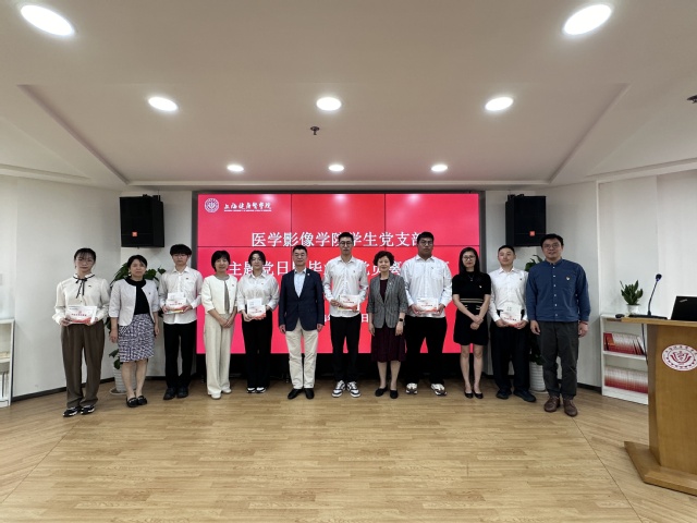 在主题党日中,党委副书记、校长吴韬、党委副书记、副校长唐红梅、党委常委、组织部部长张可菡、医学影像学院党总支书记朱清共同为毕业党员学生赠送了纪念品。