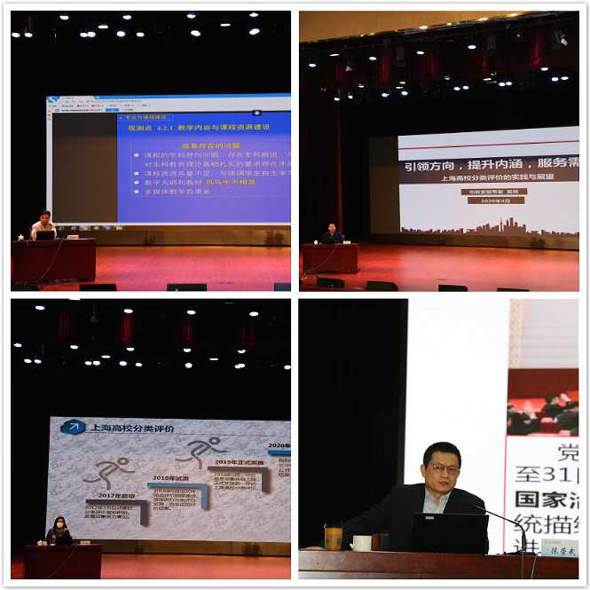 3位专家受邀作专题报告。复旦大学评估院陈建新教授以《关于合格评估指标体系的解读——迎接本科教学合格评估》为题,围绕“以评促建、以评促改、以评促管、评建结合、重在建设”的20字方针,全面介绍了本科合格评估指标体系的12个特点、合格评估的核心内涵、医学类院校部分指标的调整,围绕7个一级指标、20个二级指标、39个观测点对合格评估指标体系作了解读。陈教授提出,在指标完成上要做到点面结合,突出特色。上海市政府教育督导室副主任戴勇以《上海高校分类评价的实践与展望》为题、督导室主任科员王娟以《上海高校分类评价应用型评价指标解读》为题,对应用技术型高校建设作了全景式精彩报告,有助于学校领导干部从宏观上把握政策制定的背景、实施的意义、发展的方向,对本校当前的建设水平特点、发展短板、努力方向有了更多的思考和认识。