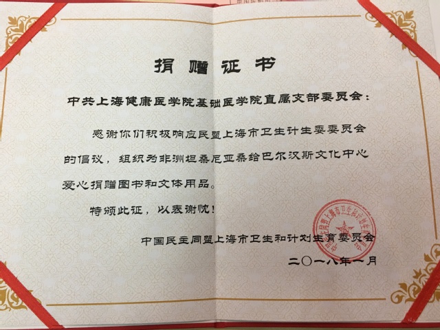 应民盟上海卫生计生委倡议,我校基础医学院直属党支部教师积极为非洲坦桑尼亚桑给巴尔汉斯文化中心爱心捐赠,共捐图书249本,练习本133本,笔110支,其他文具用品55件。爱心捐赠活动受到民盟上海市卫生计生委表彰。(统战部)