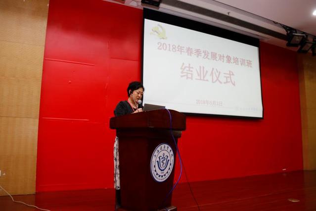 会上,郭戎静代表学校党委及党校向顺利结业的发展对象们表示了祝贺,她认为,党校作为加强入党积极分子和发展对象的培养教育的重要阵地,进一步加深了学员们对党的基本理论知识的理解,提升了党性修养。她提出了三点要求:一是继续加强理论学习,坚定理想信念。希望大家“趁热打铁”,巩固学习成果,激发学习热情,始终用科学理论指导奋斗和前进的方向;二是要学以致用,进一步提高政治意识。在学习培训基础上,进一步端正入党动机,切实解决好入党为了什么、为什么入党、入党后怎么做的问题,想清楚、弄明白,主动接受组织的考察和考验,在踏踏实实的工作奉献中成长成熟;要主动向组织汇报思想,向优秀党员学习、看齐,自觉接受组织的教育培养;三是发挥先锋模范作用,以实际行动争取早日入党。 她希望学员们今后要结合自身实际,对照党员要求,从严要求自己,带头钻研业务、刻苦学习,勇于探索新知识、新领域,开拓视野、提升能力;要肯吃苦、讲奉献,从学生时代就培养艰苦奋斗精神和全心全意为人民服务的意识;要带头培育和践行社会主义核心价值观,弘扬优良的师德师风、校风学风,养成良好的行为习惯和道德情操;要带头将自身的奋斗奉献和价值体现,同实现伟大的中国梦和学校事业发展紧密结合,坚定人生信仰,坚守平凡梦想,实现人生精彩,以实际行动争取早日入党。