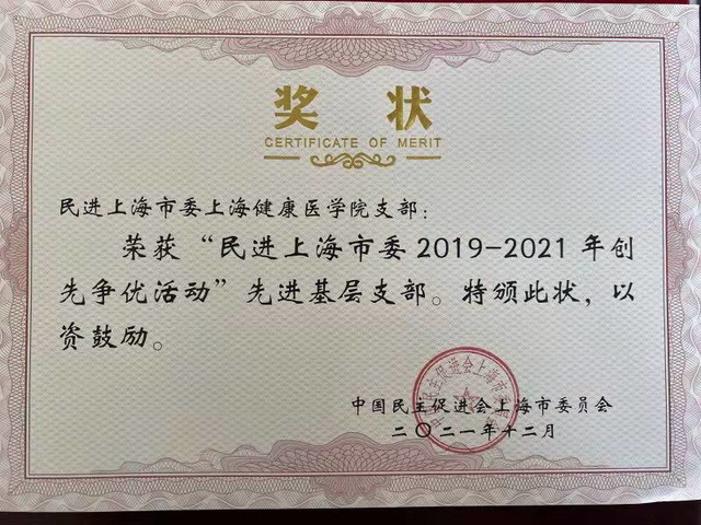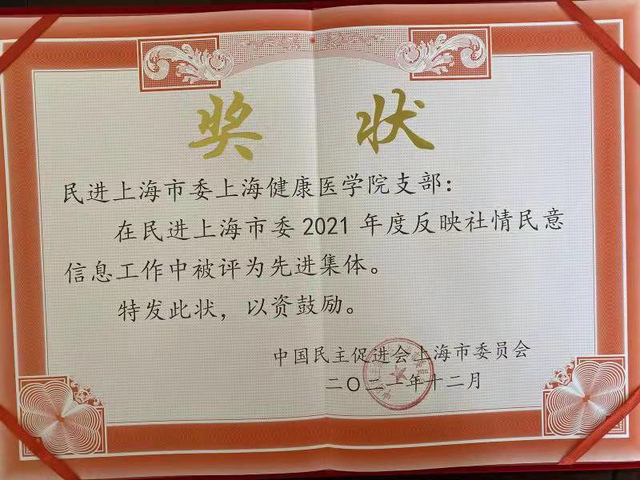 民进支部自2018年11月成立以来,在民进上海市委和中共上海健康医学院委员会的领导下,以习近平新时代中国特色社会主义思想为指导,在思想政治建设、组织建设、履职能力建设、支部自身建设上下功夫,不断激发支部活力,运用集体智慧,创新工作机制,对标民进市委创建“优秀支部”的要求,全面达标8个量化指标,支部建设水平全面提升。尤其在建言献策上成绩突出,支部已投稿数9篇,民进上海市委录用数5篇,民进中央、市政协、市委统战部采用数1篇列全市高校民进直属支部第一名的好成绩。主委江孝渔荣获民进上海改革开放40周年“四十年·双岗建功四十人”表彰。